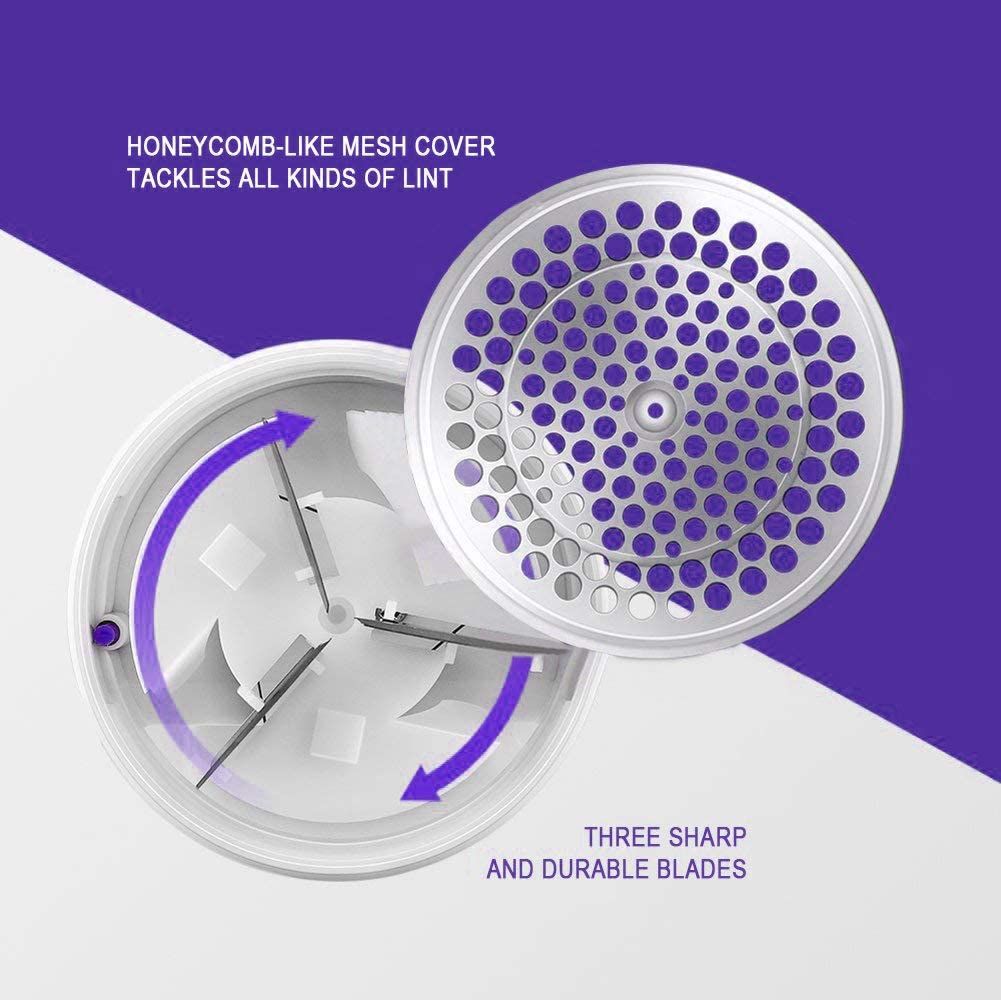 - Cuchillas de Acero Inoxidable: Tres cuchillas engrosadas y flexibles eliminan pelusas de forma rápida y eficaz, incluso en tejidos gruesos.